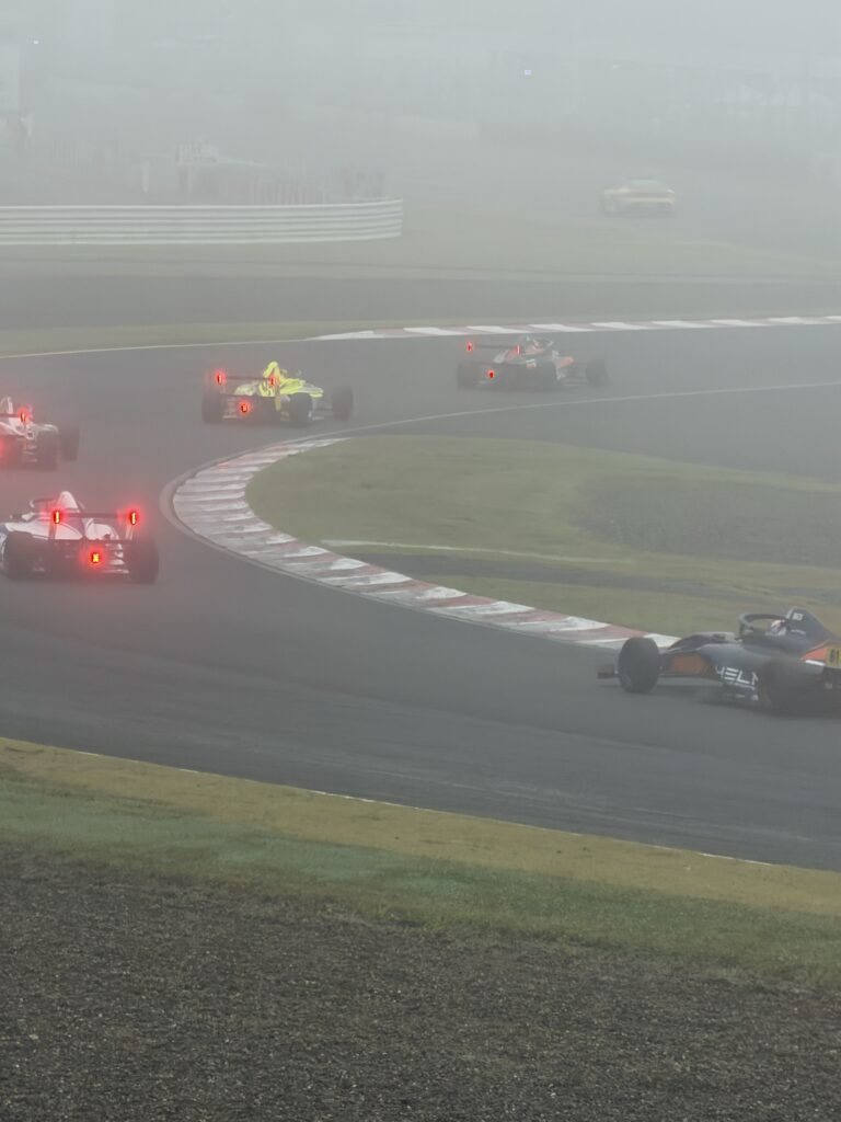 霧の中セーフティーカースタート、途中クラッシュもあり、ほとんどセーフティーカー先導のレースでした。